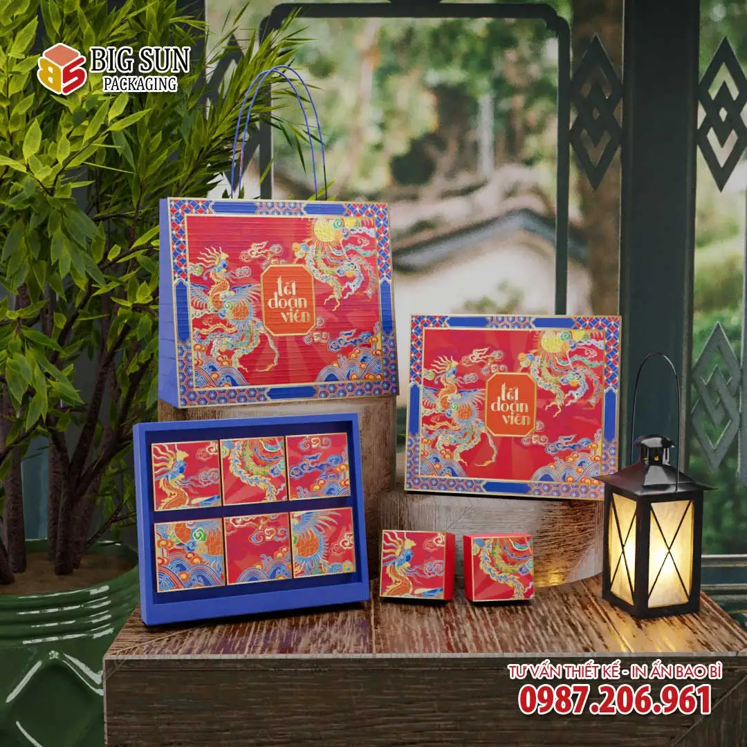 Mẫu hộp này được kết hợp 2 màu chính là màu xanh và màu đỏ. Các họa tiết trên vỏ hộp là hình ảnh long phụng rất hợp với tiết trời Trung Thu. Bộ hộp cao cấp thiết kế tỉ mỉ với các hộp con cũng được đồng bộ về họa tiết và màu sắc. Bạn có thể tham khảo kỹ lưỡng hơn ngay bên dưới.