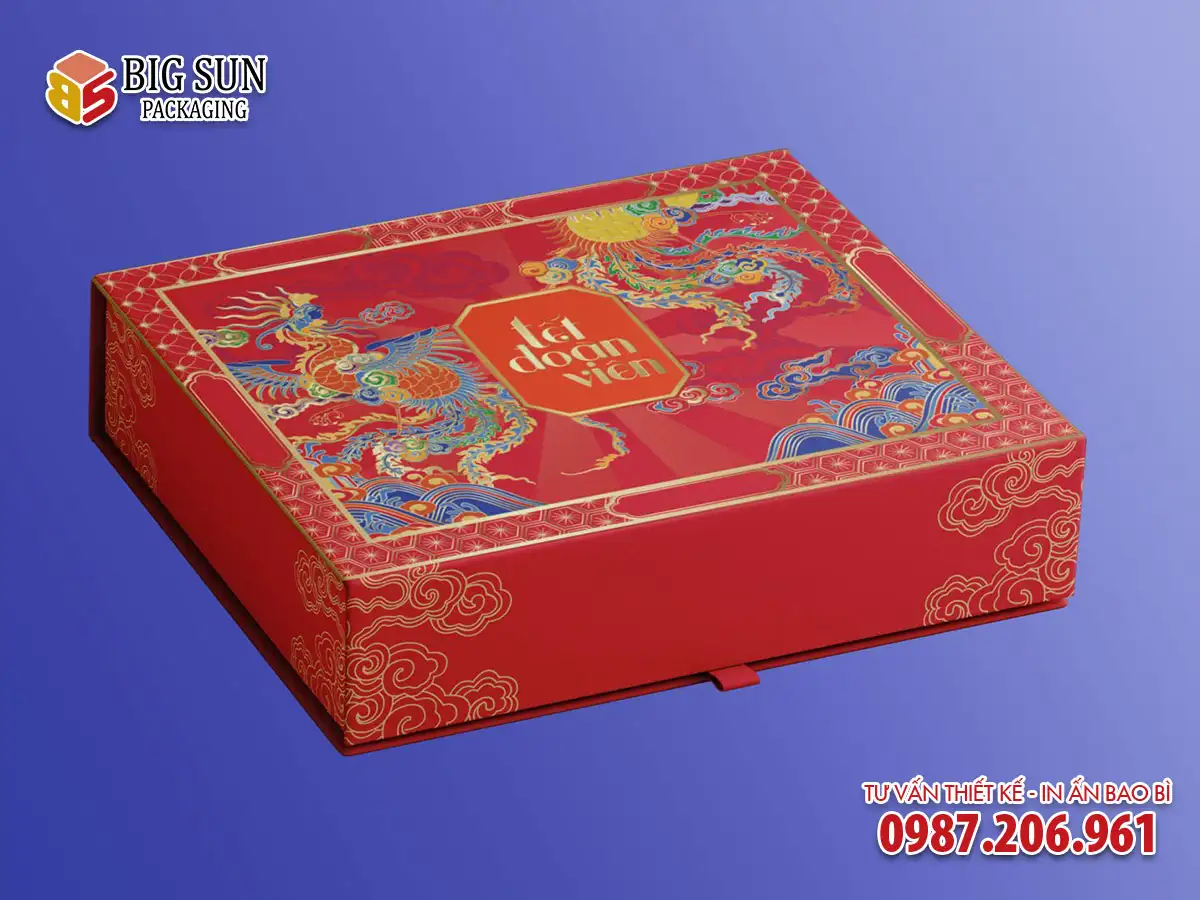 6 hộp con có màu chủ đạo là màu đỏ và cũng được thiết kế họa tiết Rồng Phụng đồng nhất với họa tiết vỏ hộp và túi giấy.