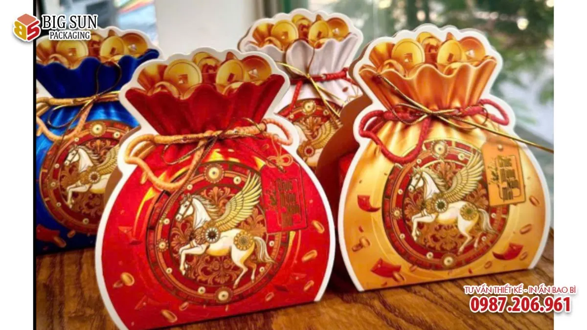 Trong các mùa Tết gần đây, Big Sun được biết đến là đơn vị in bao bì định hướng rõ ràng về concept quà Tết mang giá trị biểu trưng. Với dòng hộp đựng bánh kẹo hình túi tiền, Big Sun không chạy theo thiết kế cầu kỳ quá mức mà tập trung vào ý nghĩa cốt lõi: tài lộc – hanh thông – bền vững.