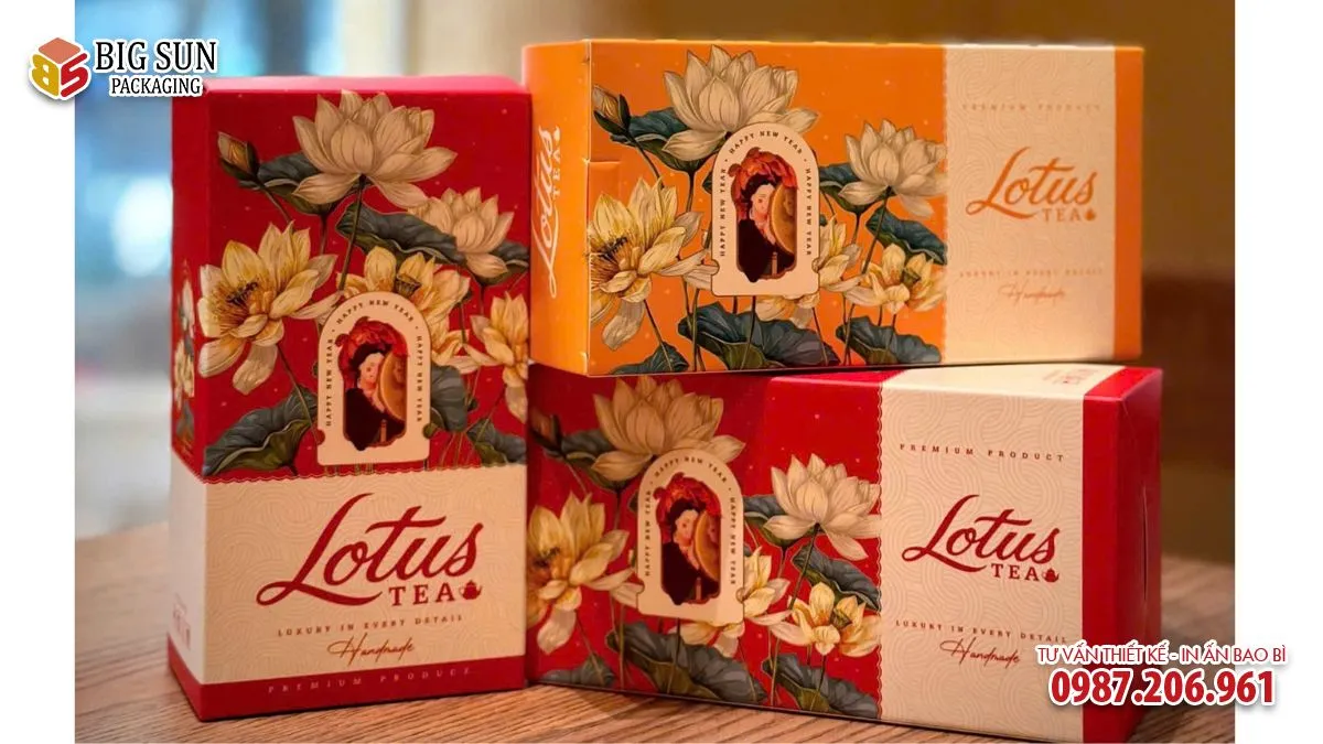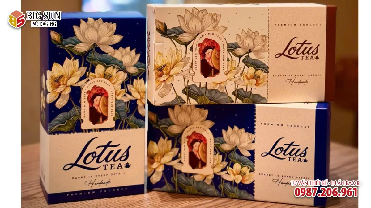 Các đường nét minh họa mảnh, chi tiết nhỏ vẫn giữ được độ rõ ràng, cho thấy quy trình in được kiểm soát kỹ lưỡng. Ngoài in màu, hộp còn sử dụng các kỹ thuật gia công sau in như ép kim, dập nổi và phủ UV định hình. Logo Lotus Tea và các khung viền thường được ép kim ánh vàng hoặc ánh đồng, tạo hiệu ứng bắt sáng nhẹ khi nhìn nghiêng.