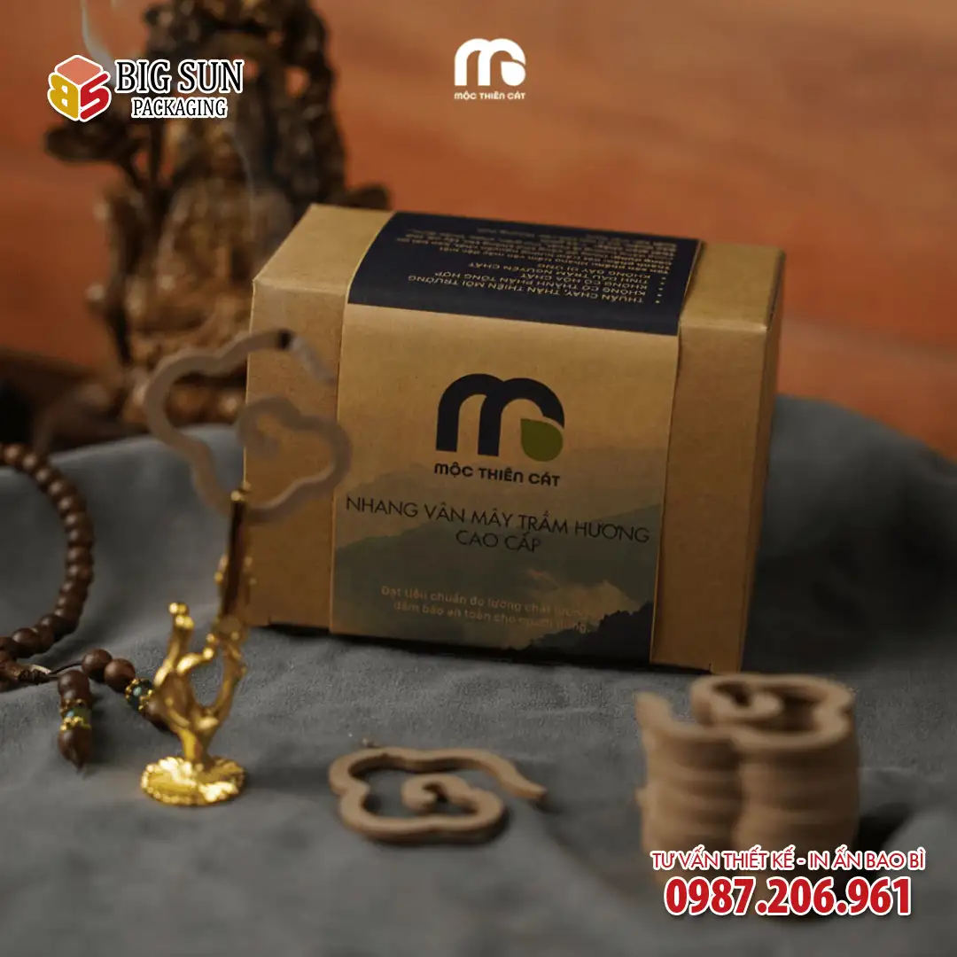 Mẫu hộp đựng nhang trầm hương vân mây Mộc Thiên Cát do Big Sun thiết kế và sản xuất là một minh chứng hoàn hảo cho sự kết hợp giữa vẻ đẹp mộc mạc và đẳng cấp sang trọng. Đây không chỉ là một chiếc hộp, mà là một giải pháp bao bì toàn diện, được nghiên cứu kỹ lưỡng để tôn vinh giá trị sản phẩm bên trong.