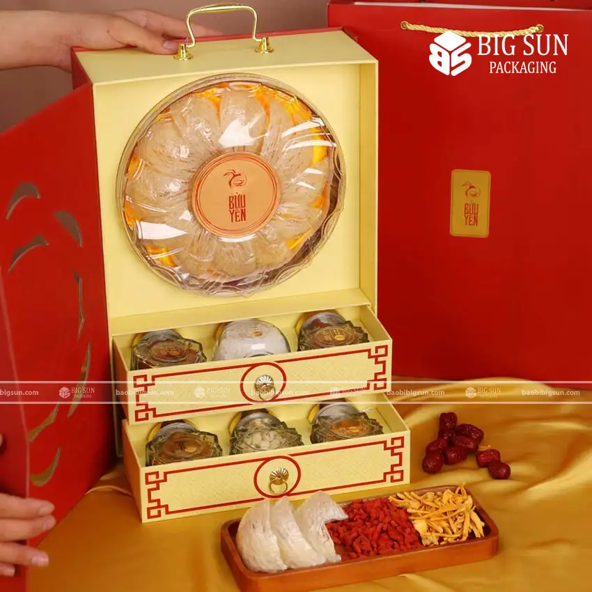 Mẫu hộp yến sào Bửu Yến Nhất Phẩm chính là nguồn cảm hứng đỉnh cao cho phong cách này. Đây là lựa chọn hoàn hảo cho các thương hiệu muốn định vị sản phẩm của mình ở phân khúc xa xỉ, chuyên dùng làm quà biếu tặng các đối tác VIP, khách hàng trọng yếu hoặc những người thân yêu nhất.