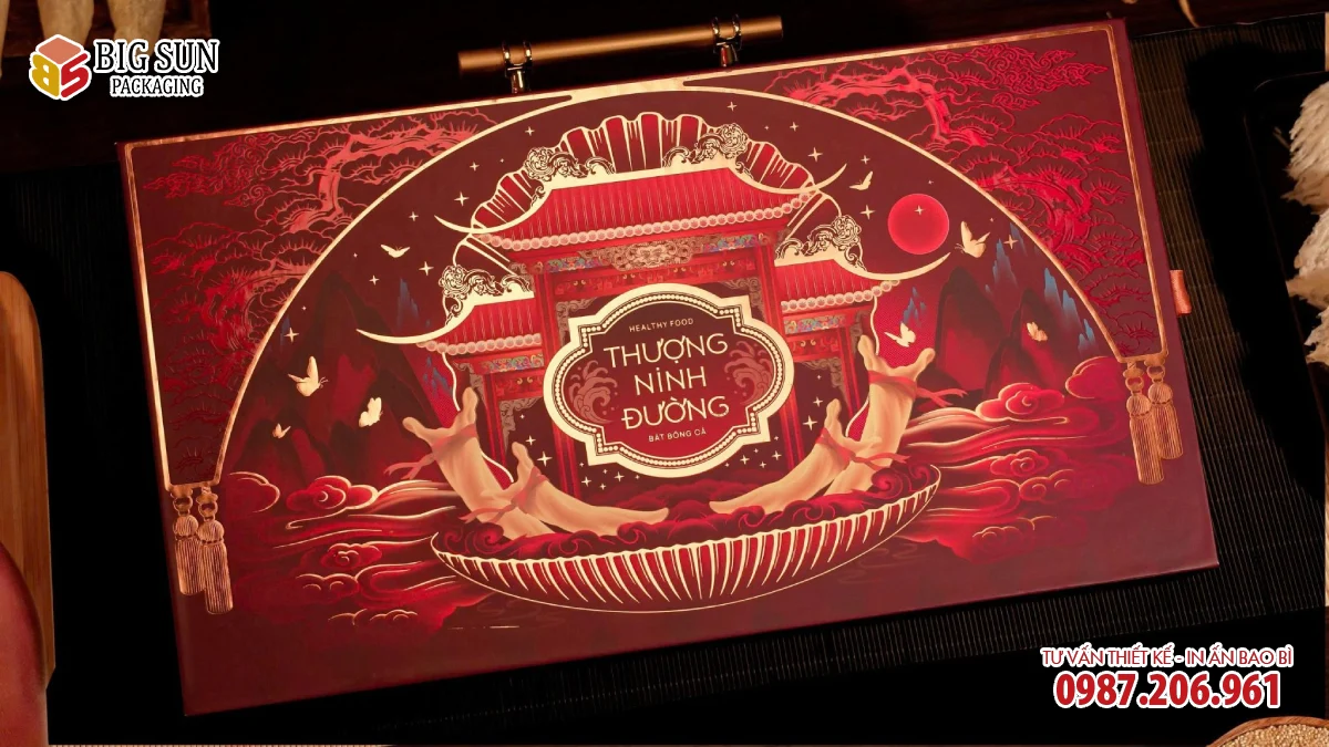 Mẫu hộp đựng Soup bóng cá tổ Yến cao cấp được lấy cảm hứng từ phong cách truyền thống Á Đông. Hộp được thiết kế với bố cục cân đối và các chi tiết trang trí mang tính biểu tượng, tạo nên ấn tượng sang trọng ngay từ ánh nhìn đầu tiên. Thiết kế hộp không chạy theo sự cầu kỳ phô trương mà tập trung vào sự chỉn chu, bề thế và hài hòa trong từng đường nét.