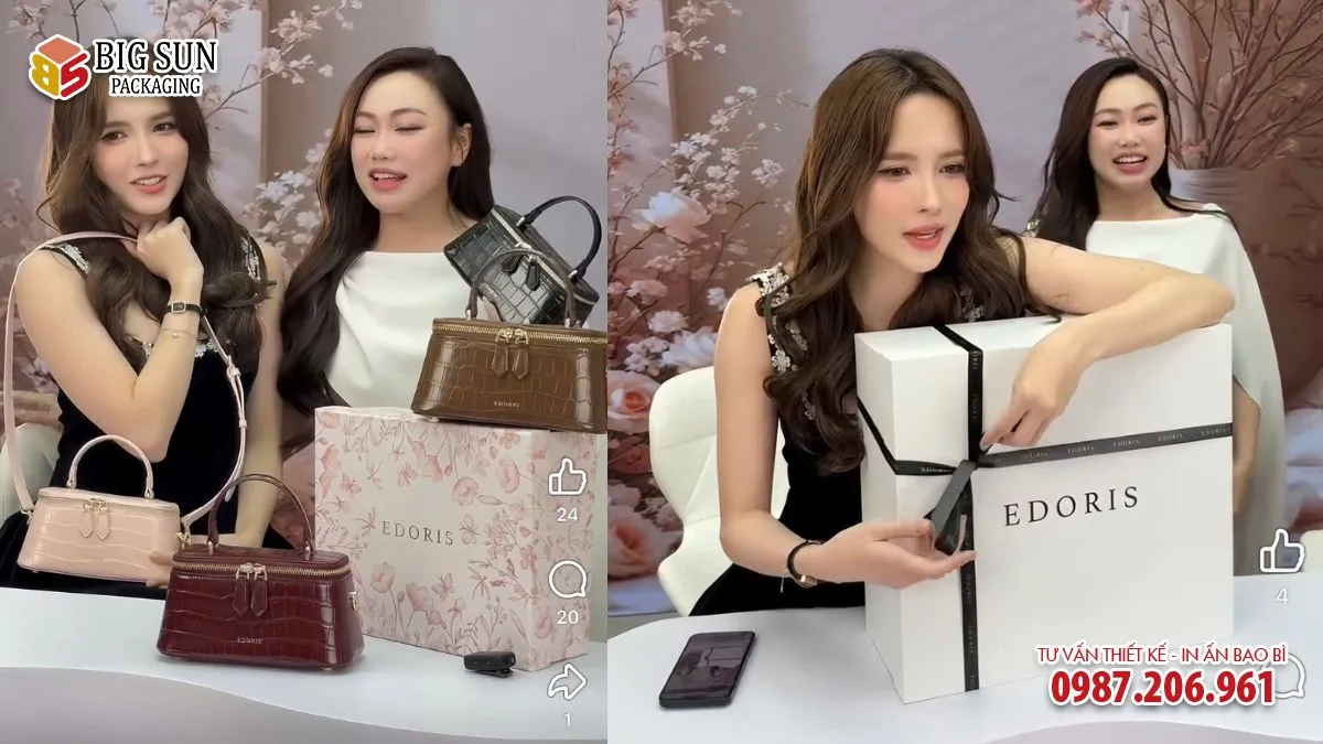 Việc in ấn logo và thông điệp thương hiệu một cách khéo léo giúp túi xách Edoris dễ dàng được nhận diện và quảng bá rộng rãi thông qua các bức ảnh “unboxing” trên mạng xã hội.