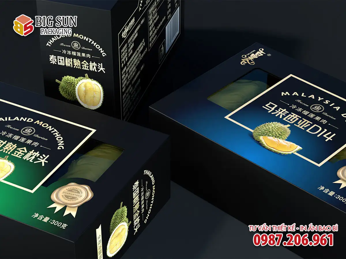 Trong khi đó, màu đen và xanh đậm lại khẳng định vị thế sang trọng, sẵn sàng chinh phục những thị trường hộp carton sầu riêng xuất khẩu khó tính nhất. Trên nền màu sâu thẳm ấy, từng chi tiết ép kim vàng óng ánh tỏa sáng như những vì sao, từ logo thương hiệu đến những đường viền tinh xảo, mang lại cảm giác “vương giả” không thể chối từ.