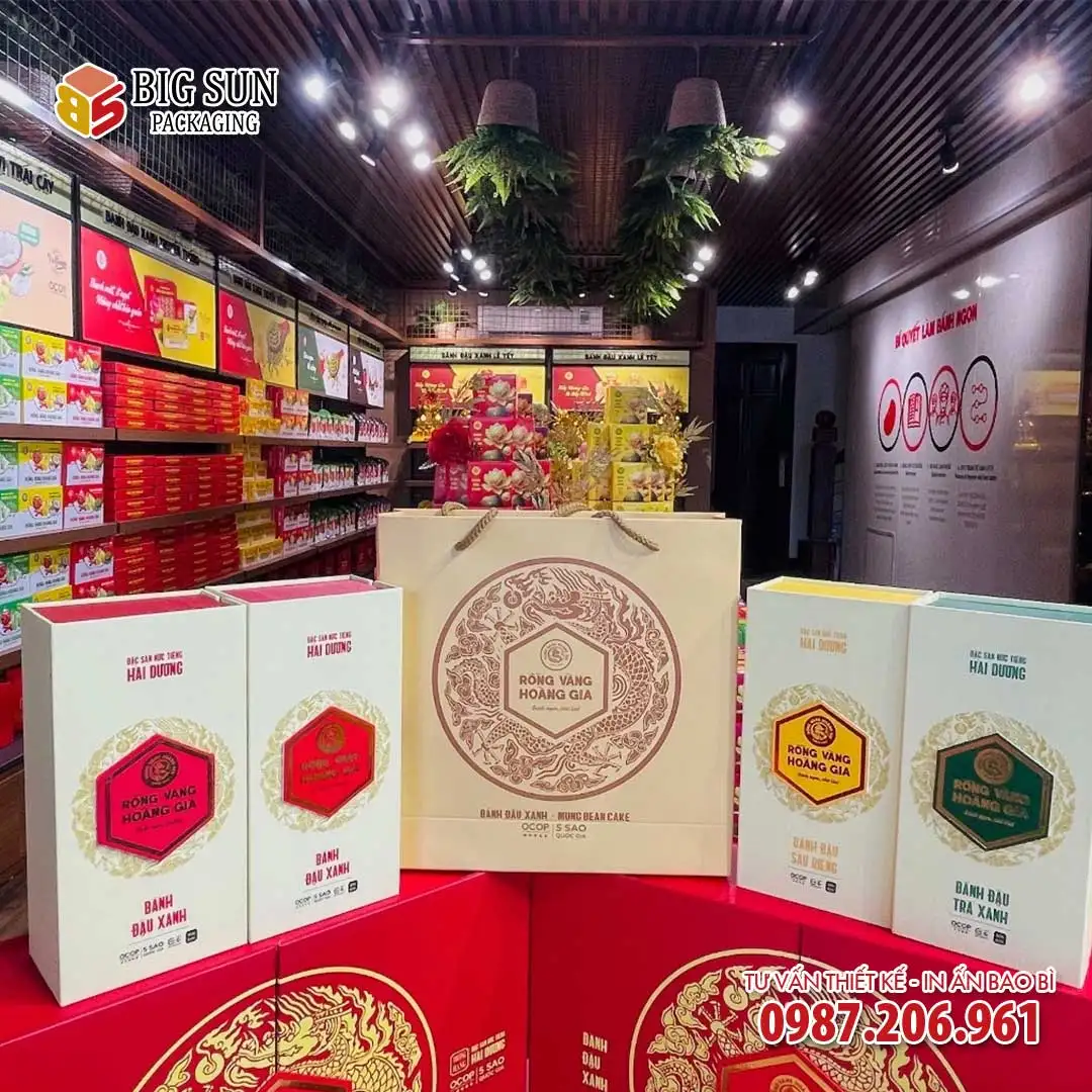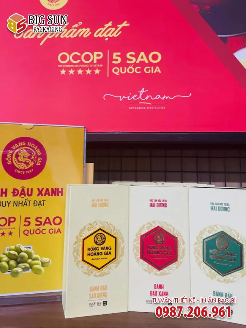 Mẫu in hộp đựng bánh đậu xanh Hoàng Gia OCOP là một trong những minh chứng rõ nét cho năng lực thiết kế và sản xuất của Big Sun. Chúng tôi không chỉ tạo ra một chiếc hộp, chúng tôi kiến tạo một giải pháp đóng gói toàn diện, giúp sản phẩm bánh đậu xanh truyền thống chinh phục những thị trường khó tính nhất, khẳng định vị thế trên bản đồ đặc sản Việt.