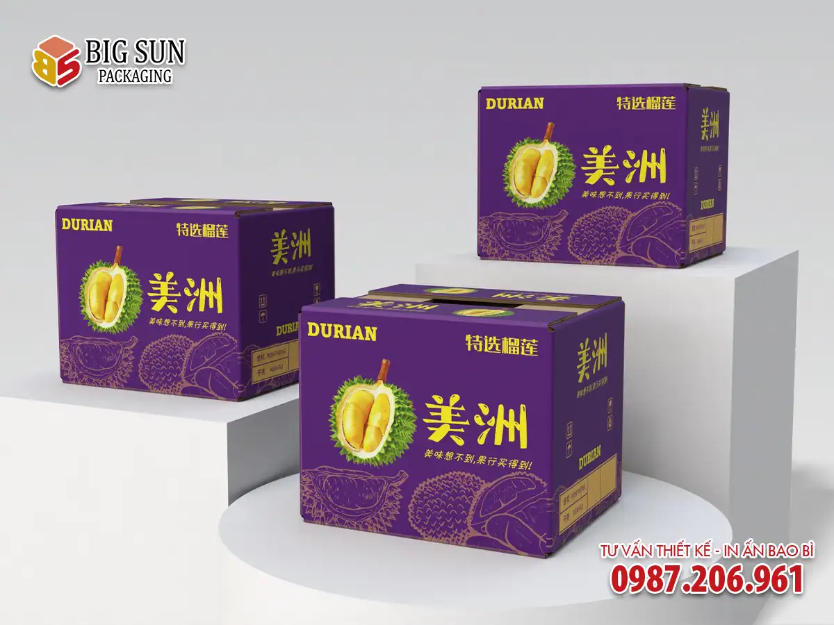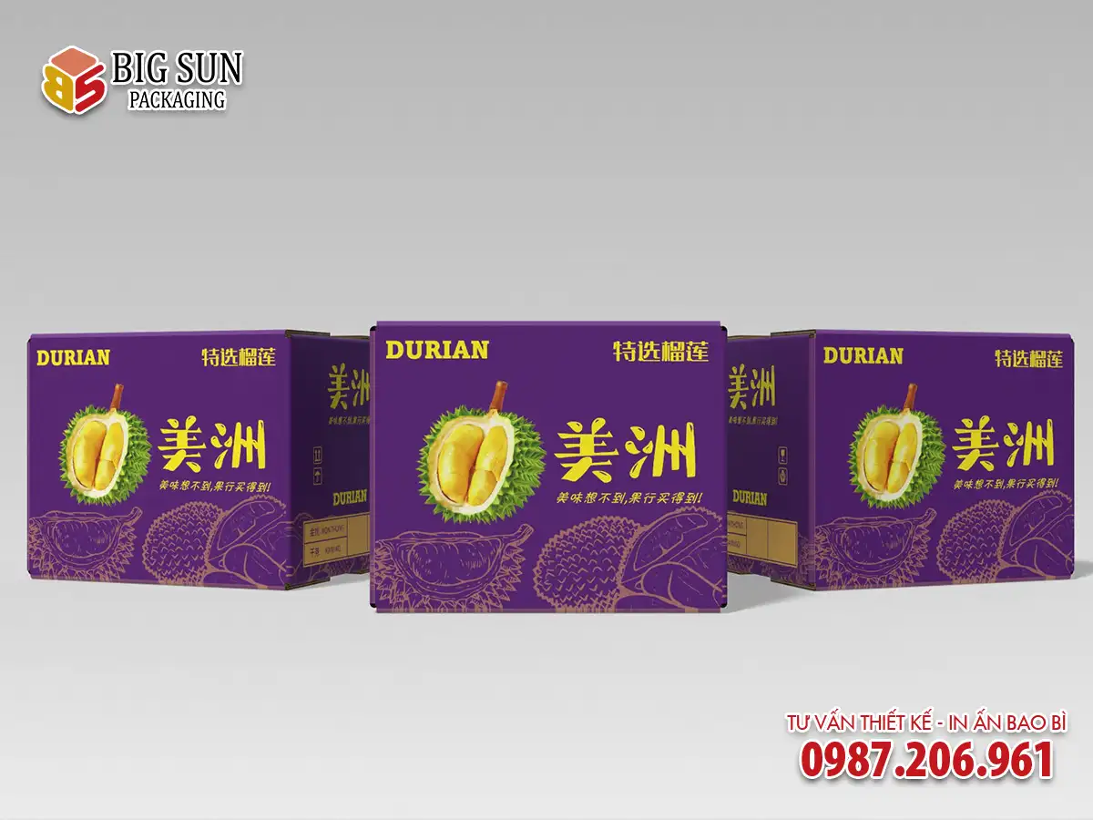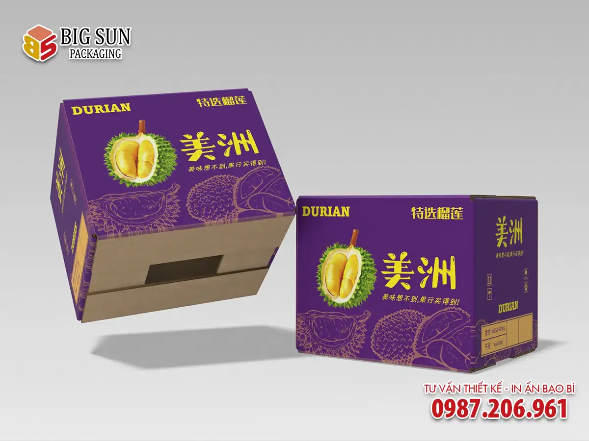 Hãy tạm quên đi những mẫu thùng carton thông thường, Big Sun sẽ giới thiệu đến bạn mẫu in thùng carton đựng sầu riêng màu tím dưới đây – một thiết kế đột phá, một tác phẩm nghệ thuật thực sự sẽ giúp sản phẩm của doanh nghiệp tạo ấn tượng sâu sắc trên bất kỳ quầy hàng nào.